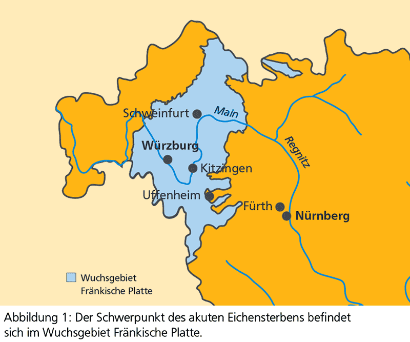 Im Frühjahr 2009 verursachte der Eichenwickler (Tortrix viridana) massive Fraßschäden in Mittel- und Unterfranken, Hauptschadensgebiet war die Fränkische Platte (Abb. 1). Starker Fraß bis Kahlfraß fand vorwiegend an Einzelbäumen und Baumgruppen statt. Parallel dazu trat der Eichenprozessionsspinner (Thaumetopoea processionea) stark auf und führte zu einer weiteren Entlaubung. Letzterer ist kritisch zu bewerten, da er auch den Johannistrieb und damit die Regeneration der Eichen betrifft. Die Eichen konnten sich zunächst gut erholen, wurden dann aber massiv vom Eichen-Mehltau (Microsphaera alphitoides) erfasst. Durch die feucht-kühle Witterung während der Sporenkeimung und warme, windige Tage im Anschluss wurden die jungen und wenig widerstandsfähigen Blätter der Johannistriebe befallen, es kam zu einem erneuten Verlust sämtlicher Ersatztriebe.