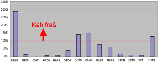 Erfahrungsgemäß nehmen die durch den EPK verursachten Schäden mit zunehmendem zeitlichen Abstand zur letzten Gradation der genannten Schmetterlingsarten ab, insbesondere wenn in diesen Jahren für das Baumwachstum günstige Witterungsbedingungen herrschen. So war 2009 ein seit 1994 in Südwestdeutschland nicht mehr erreichter Tiefstand der gemeldeten Schadfläche zu verzeichnen (Abb. 1).