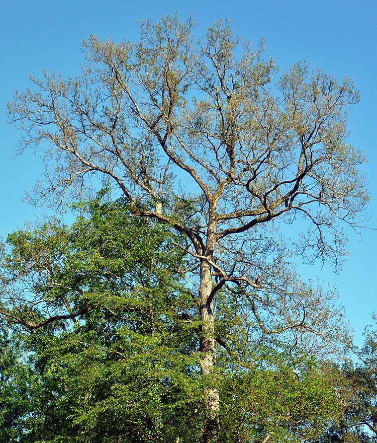 Dementsprechend werden im Frühjahr 2012 aktuell zum Beispiel in der südlichen Oberrheinebene auch Fraßschäden festgestellt (Abb. 5). In den von Kahlfraß betroffenen Beständen ist in den Folgejahren davon auszugehen, dass die Abwehrkräfte der Eichen abermals deutlich herabgesetzt sein werden. Deshalb besteht die Gefahr, dass sich der EPK wieder etablieren und zahlreiche Eichen zum Absterben bringen wird.