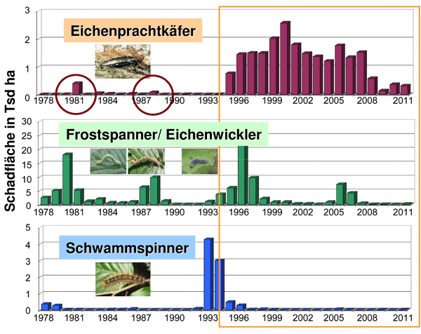 Die Eiche ist bis nach Südeuropa verbreitet und an die klimatischen Bedingungen angepasst. Sie reagiert flexibel auf Trockenheit und Wärme. Im Wirtschaftwald muss sie zur Erzielung hoher Wertleistungen im Vergleich zu anderen Baumarten besonders alt werden. Mit zunehmender Seneszenz steigen allerdings die Empfindlichkeit und das Risiko des Absterbens infolge eines Befalls durch Schaderreger deutlich an. Die Eiche leidet in Mitteleuropa in Abständen von 7 bis 10 Jahren regelmäßig unter mehr oder weniger starkem Blattfraß durch Frostspanner-Arten, oft mit anschließendem Mehltaubefall der Regenerationstriebe. Zudem finden die besonders wärmeliebenden Eichenschädlinge Schwammspinner, Eichenprozessionsspinner und Eichenprachtkäfer seit etwa zwanzig Jahren im Zusammenhang mit klimatischen Veränderungen deutlich günstigere Entwicklungsbedingungen als in der Vergangenheit vor. Deshalb sind zur Sicherung der Eichenwälder im Rahmen einer integrierten Waldschutzstrategie von Zeit zu Zeit differenzierte und ausgewogene Maßnahmen gegen diese Schaderreger durchaus in Erwägung zu ziehen. Dabei ist zu berücksichtigen, dass die vielfältigen Ansprüche des Naturschutzes an ältere Eichenbestände mit ihrer hohen Biodiversität ein Konfliktpotenzial für die Durchsetzung dieser Strategie darstellt.