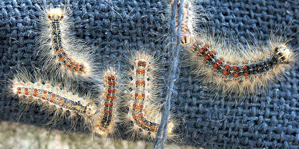 In Südwestdeutschland ist seit dem Sommer 2011 nach Kahlfraß durch Schmetterlingsraupen und Mehltaubefall der Regenerationstriebe in den Vorjahren lokal wieder ein beträchtliches Eichensterben mit Beteiligung des EPK festzustellen (Abb. 2a, b). Betroffen sind in Baden-Württemberg insbesondere die Landkreise Main-Tauber, Hohenlohe, Schwäbisch-Hall und Ortenau sowie in Rheinland-Pfalz die Forstämter Simmern und Birkenfeld im Hunsrück. Dabei wurden die Fraßschäden von Raupen des Frostspanners, des Eichenwicklers oder des Schwammspinners (Abb. 3a, b) verursacht. Im Landkreis Schwäbisch-Hall hat der Raupenfraß durch EPS in Südwestdeutschland erstmals zu einem ausgedehnten Eichensterben geführt. In den Jahren zuvor sind die vom Raupenfraß des EPS betroffenen Eichen zum Bespiel im Landkreis Heilbronn nur im geringen Umfang und lediglich einzelbaumweise abgestorben. Spätestens mit diesem Befund ist dieser Nachtfalter jetzt auch in Südwestdeutschland als potenzieller Waldschädling mit hohem Gefährdungspotenzial für die Eichen anzusehen.