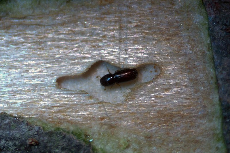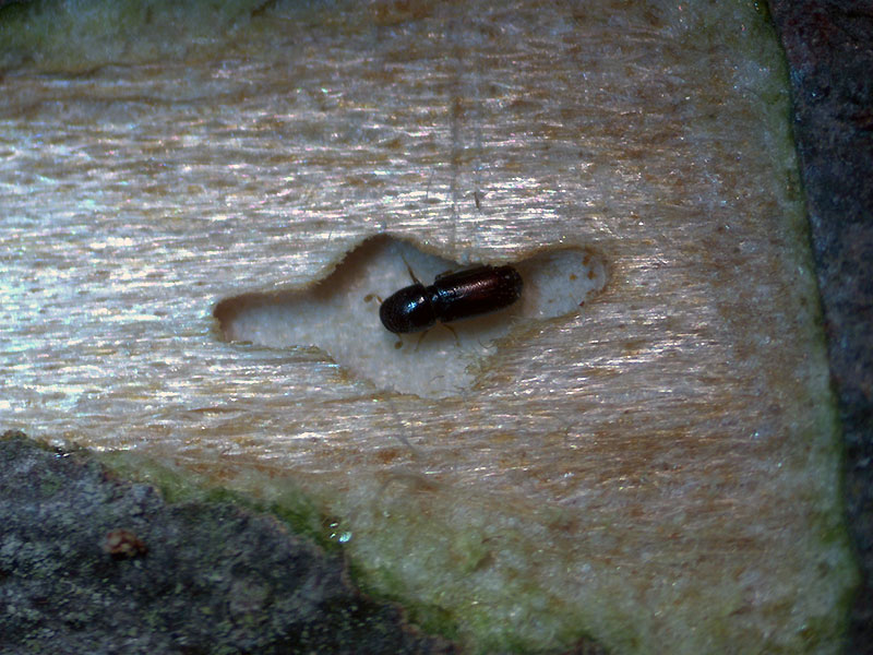 Erschwerend kommt es an stark geschwächten Individuen zu Brutversuchen des Furchenflügeligen Fichtenborkenkäfers (Abb. 3b) oder des Kupferstechers. Absterbende und wipfeldürre Douglasien mit Käferbefall sollten daher vorsichtshalber vernichtet werden.