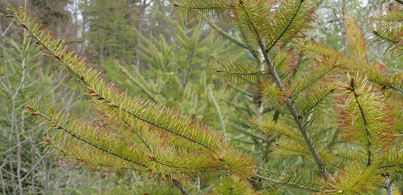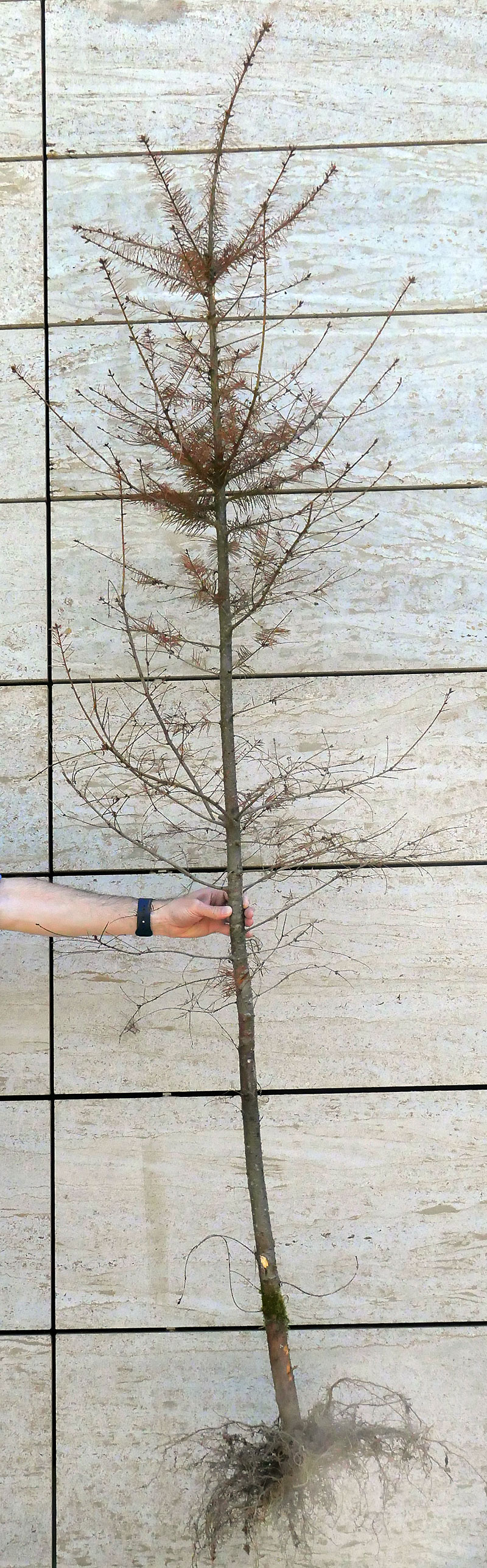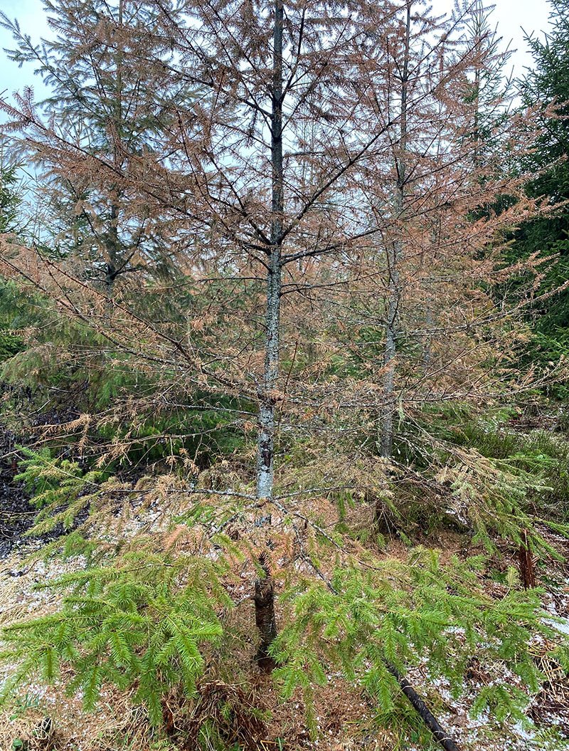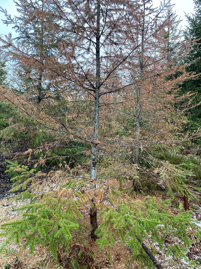 Die Hauptsymptome der physiologischen Nadelröte zeigen sich bei dem aktuellen Schadgeschehen vermehrt in der Oberkrone, wobei geschütztere Kronenbereiche von einer Schädigung ausgenommen sein können und grün verbleiben. Mit ähnlichem Bild zeichnen auch die Nadeln am Trieb selbst: am ehesten sind Nadelspitzen betroffen und die Nadelbasis bleibt teilweise noch grün (Abb. 1). Das Phänomen betrifft vor allem junge Pflanzungen. Diese Nadelröte bzw. Kronenröte ist irreversibel und in der Folge nicht selten letal für die Pflanze.