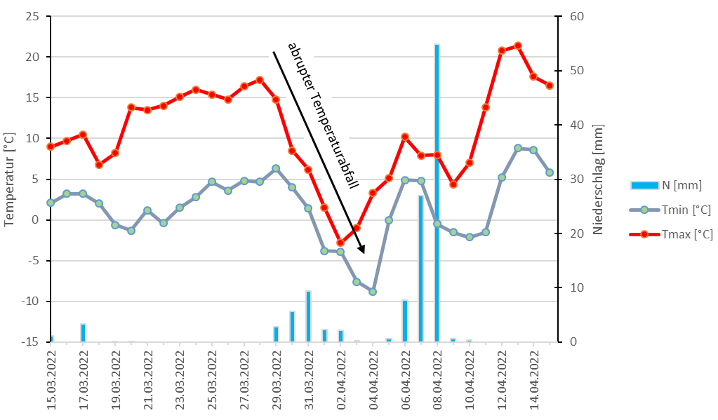 Im Vergleich zum langjährigen Mittel erwies sich der Winter 2021/2022 als überdurchschnittlich warm. Nach dem Februar, der mehrere Sturmtiefs und Regenfälle mit sich brachte, trat im März folgende, für die Douglasie ungünstige Abfolge von kurzfristigen Temperaturschwankungen, auf: Nach einer kontinuierlichen Erwärmung ab dem 8. März gab es nach Maximaltemperaturen am 28. März von 22°C in Freiburg bzw. 17°C in Freudenstadt einen Temperatursturz mit Minimaltemperaturen am 04. April von -4,8°C bzw. -8,8°C. Die Maximaltemperaturen vom 28. März sind bereits wieder nach 8 Tagen zum 12. April erreicht worden. Begleitet wurde diese in kurzer Zeit abrupte Temperaturschwankung mit 25° teilweise mit heftigen Starkregenereignissen (Abb. 2).
