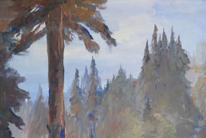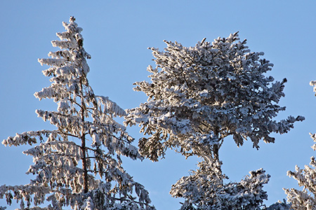 Abb. 4a: Der obere Kronenanteil der Douglasie wurde aufgrund seiner ungünstigeren Exposition gegenüber Sonneneinstrahlung und Temperaturabfällen geschädigt. Die in günstigerer Position befindlichen unteren Kronenbereiche blieben hingegen von der Schädigung durch Frosttrocknis ausgenommen (Foto: Borchers).