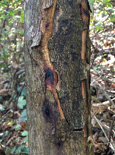 Auch Pezicula-Krebse an Roteiche und Symptome durch Anthostoma decipiens werden durch krankheitsfördernde abiotische Faktoren begünstigt. Beim Ahorn kann bei einem Befall einer Nectria-Art, in Verbindung mit einer abiotischen Vorschädigung, Schleimfluss auftreten (Abb. 3). Teilweises, durch Nectria sp. ausgelöstes Absterben der Rinde mit Schleimfluss tritt nicht nur bei Ahorn, sondern auch bei Buche, Birke und Erle auf.