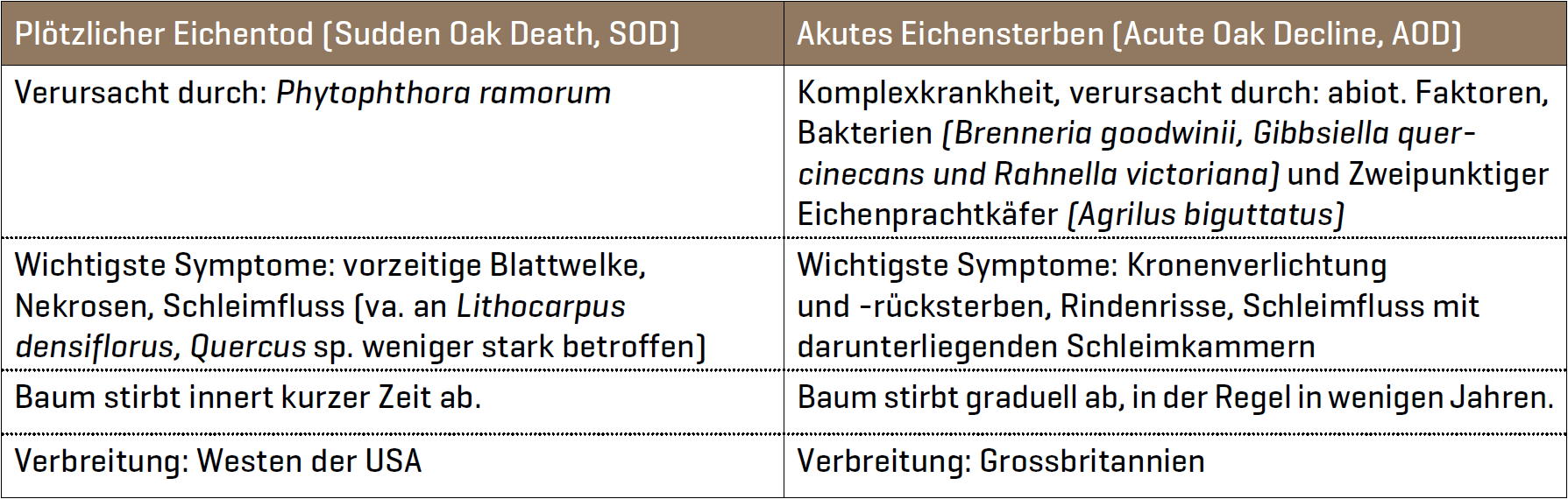 In der Schweiz gelang im Frühjahr 2017 der erste Nachweis der Bakterien Brenneria goodwinii, Gibbsiella quercinecans und Rahnella victoriana an Traubeneichen (mehr dazu). Die isolierten Bakterien, die 2008 erstmalig in Grossbritannien beschrieben wurden, stehen im Zusammenhang mit dem Akuten Eichensterben (AOD), nicht zu verwechseln mit dem Plötzlichen Eichentod (SOD) (Tab. 2).
