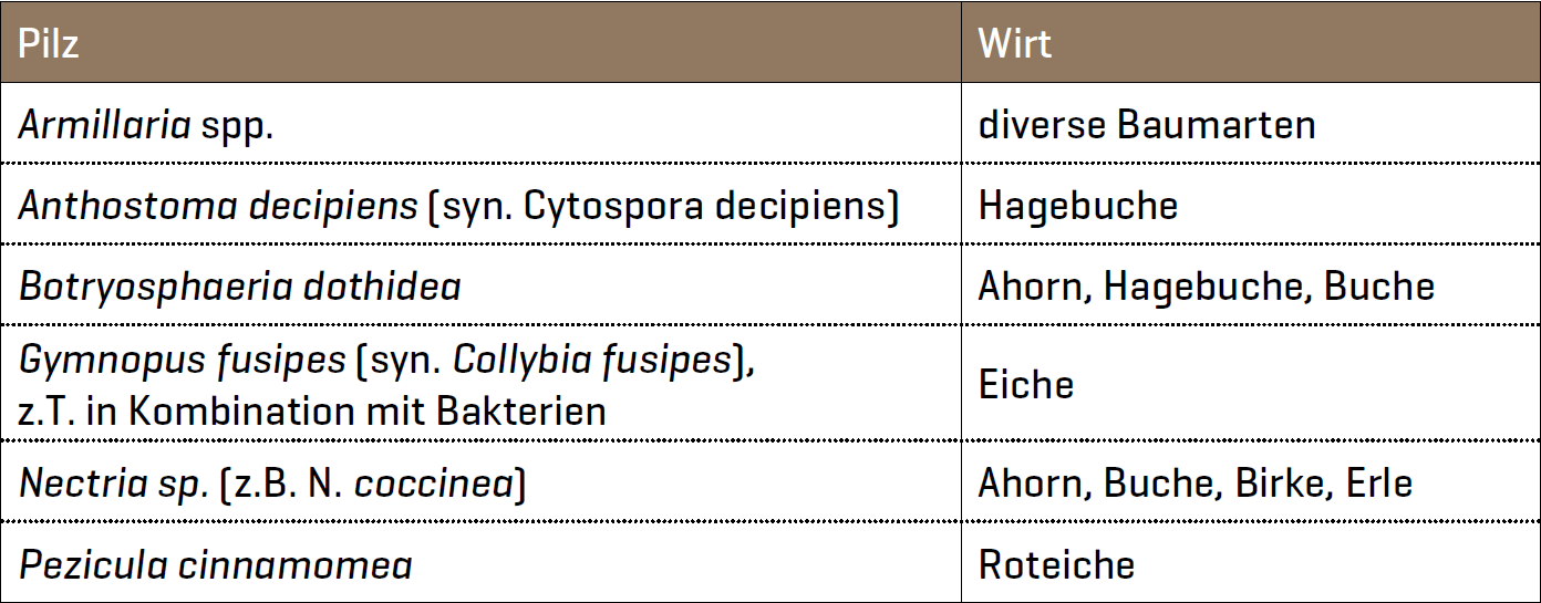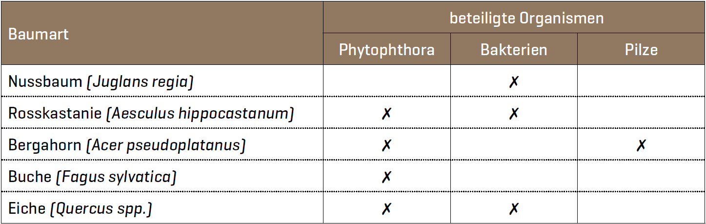 Tab. 1 - Baumarten, an denen Waldschutz Schweiz in den letzten Jahren Schleimflusssymptome beobachtet hat, und verursachende biotische Faktoren.