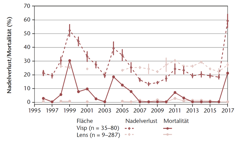 Immergrüne Nadelbäume benötigen mehrere Jahre, um die abgestossene Nadelmasse zu ersetzen und wieder die ursprüngliche Fotosyntheseleistung zu erbringen. Deshalb reduzieren aufeinanderfolgende Trockenjahre die Regenerationsfähigkeit der Waldföhre und erhöhen ihr Absterberisiko. Die ausserordentlich hohen Mortalitätsraten nach den Trockenjahren 1996, 1998 sowie 2003 bis 2005 in Visp (Abb. 3) bestätigen diese Aussage.
