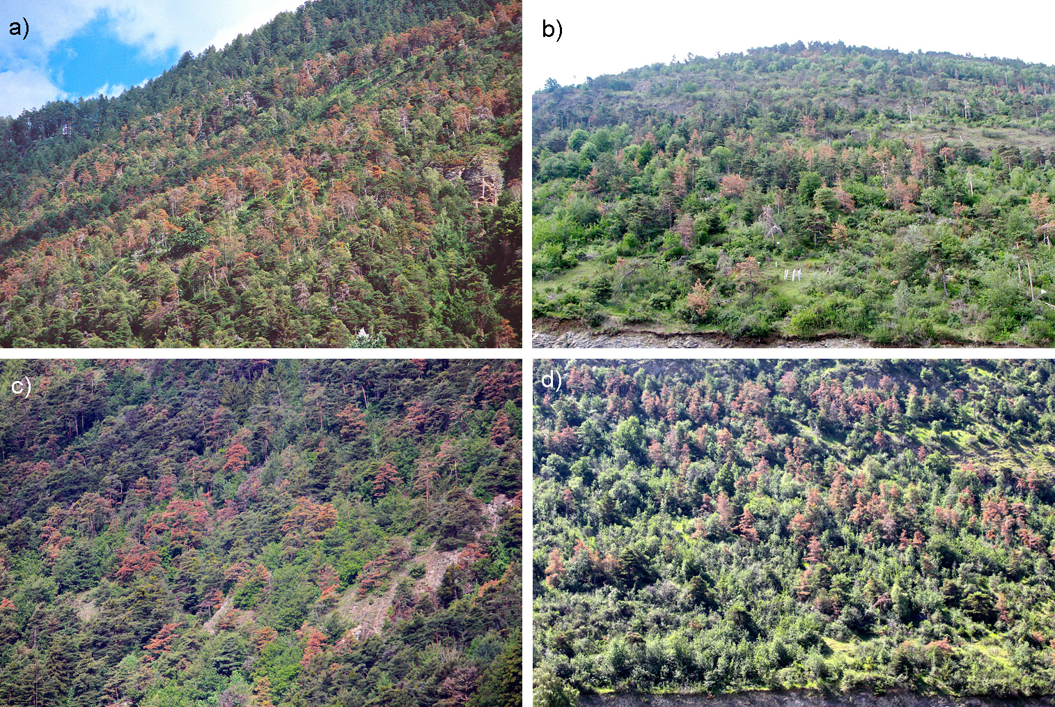 Die Waldföhrenwälder in den tieferen Lagen des Oberwallis waren in den vergangenen Jahren aufgrund von Absterbeprozessen wiederholt im Fokus des öffentlichen Interesses. Die Absterbewelle in den Waldföhrenwäldern der Region Brig-Visp 2016/2017 (Abb. 1d) ist Anlass, die Walddynamik der vergangenen 20 Jahre in dieser trockenen Region zu diskutieren.