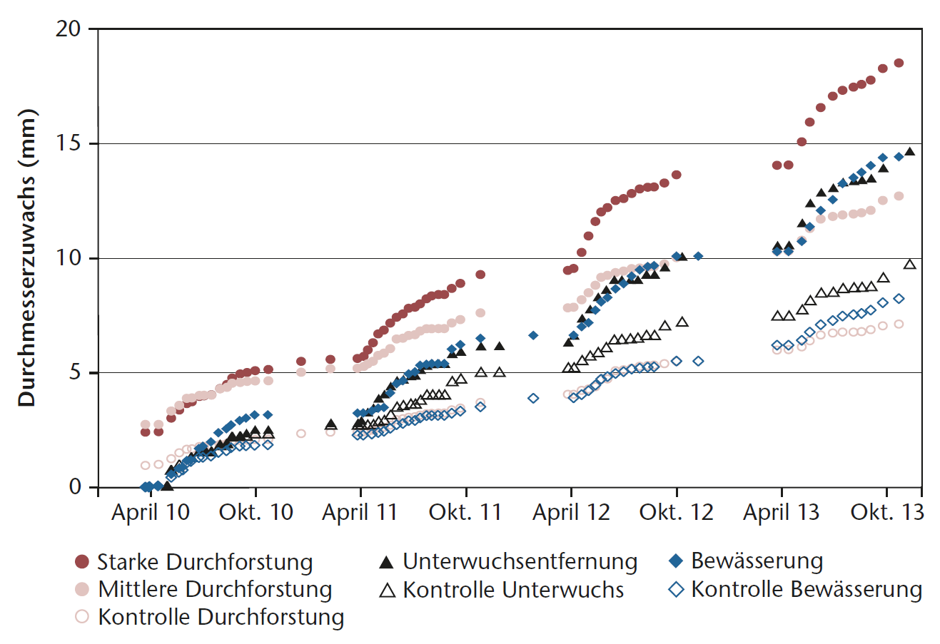 Vergleicht man den Effekt dieser Experimente, zeigt sich, dass alle drei Behandlungsarten zu einer markanten Erhöhung des Durchmesserwachstums führten (Abb. 6).