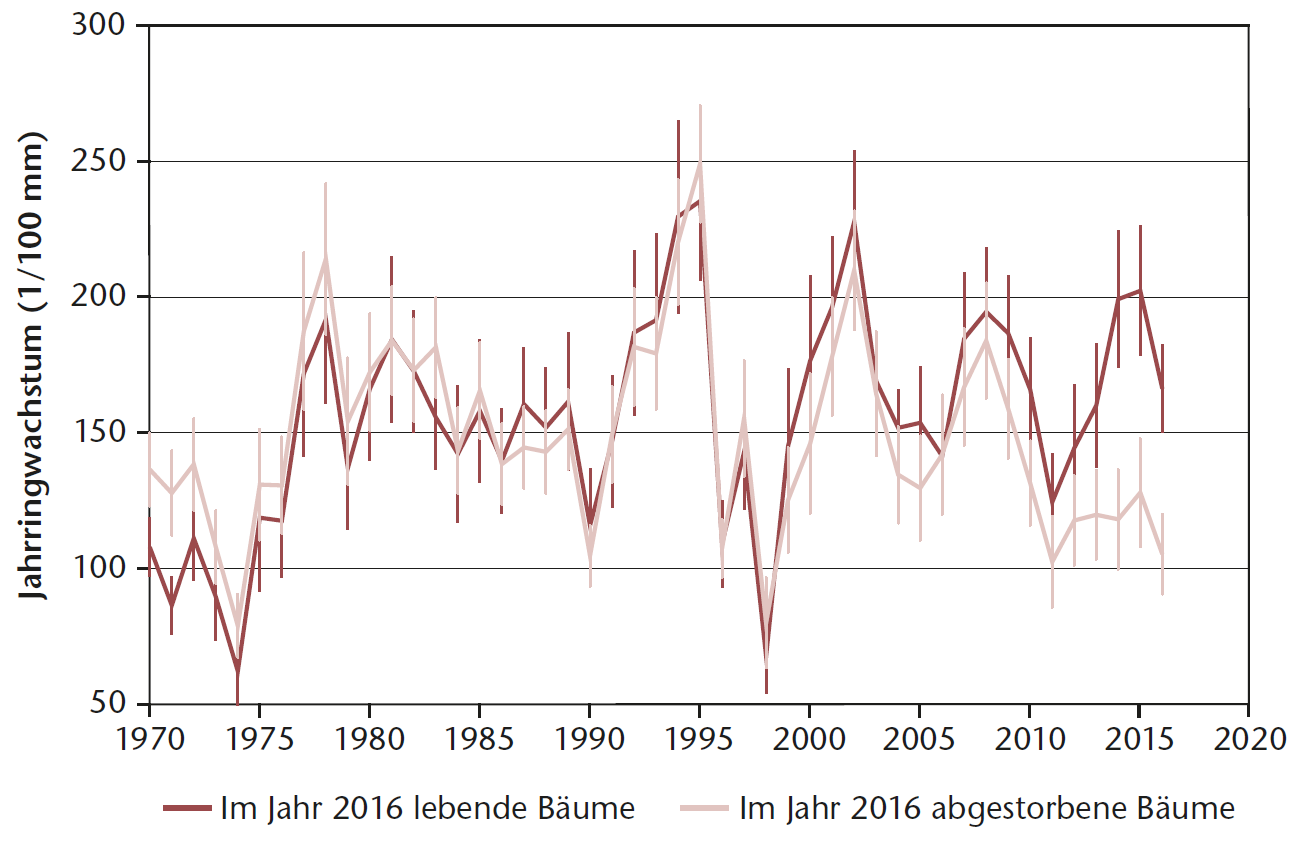 Der Vergleich des Jahrringwachstums der noch lebenden mit den kürzlich abgestorbenen Waldföhren in der Region Brig-Visp zeigte während Jahrzehnten einen äusserst synchronen Verlauf (Abb. 4). Erst nach dem Trockenjahr 1998 reduzierte sich das Wachstum der später absterbenden Bäume im Vergleich zu den weiterlebenden. Die Schere öffnete sich dann weiter nach den Trockenjahren 2003 bis 2005 und der extremen Frühjahrstrockenheit 2011. Ab 2013 war das Wachstum der heute toten Bäume signifikant geringer als dasjenige der lebenden Bäume. Dieser schwächende, das Absterben einleitende Einfluss von Trockenjahren konnte auch für tote Waldföhren im Pfynwald und in Nordspanien sowie für die Nusskiefer (Pinus edulis) in New Mexico nachgewiesen werden.