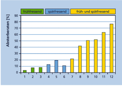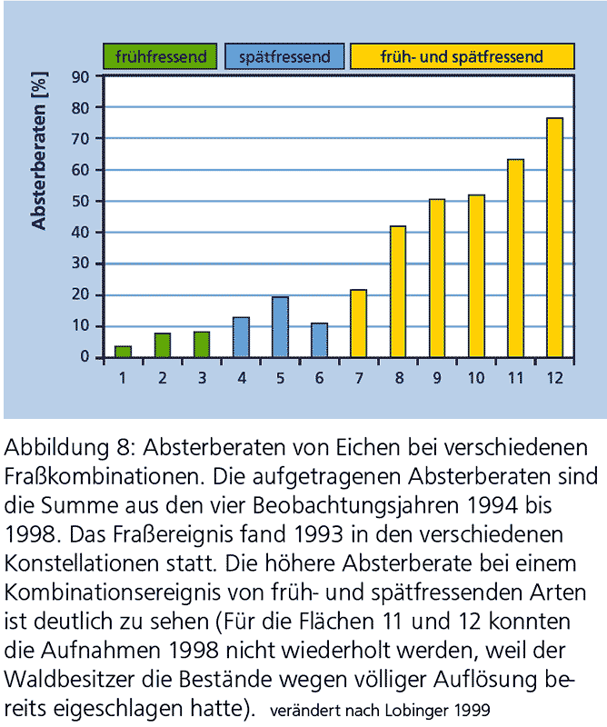 Gefährlich wird es für Eichenbestände vor allem dann, wenn Massenvermehrungen von frühfressenden und spätfressenden Arten zusammenfallen. Es kommt zu einer langanhaltenden Entlaubung der Eichen (Abb. 7). Dementsprechend steigen auch die Absterberaten (Abb. 8). Weist die Eiche über die gesamte Vegetationsperiode hinweg weniger als 30 Prozent assimilationsfähige Belaubung auf, können ganze Bestände absterben (Ausfall bis zu 90 % innerhalb von fünf Jahren).