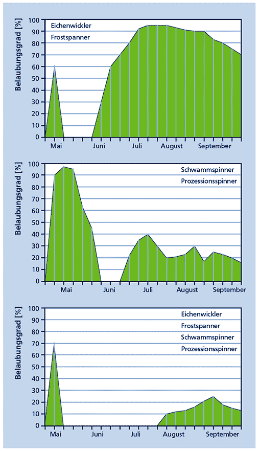 Mitte: Spätfressende Arten Schwammspinner und Eichenprozessionsspinner; nach einem normalen Laubaustrieb im Frühjahr reduziert der Kahlfraß die Belaubung stark. Diese erreicht für den Rest des Jahres nicht mehr das Ausgangsniveau.