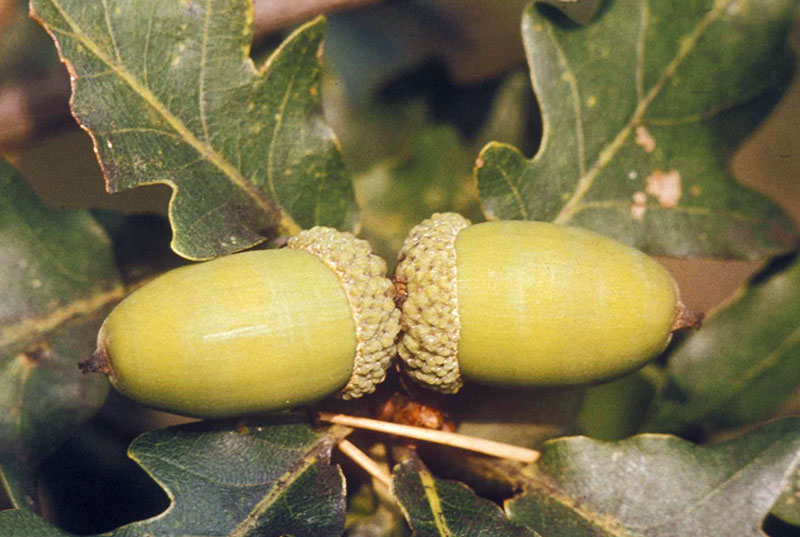 Abb. 0: Die Eicheln fressen Eichhörnchen und Wildschwein gerne, aber auch die Blätter der Traubeneiche sind beliebt - vor allem bei Insekten (Foto: Bayer. Forstverwaltung).