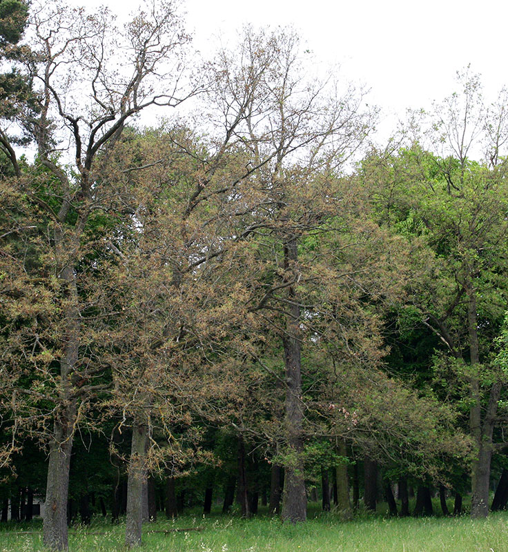 Schwerer wiegt der Fraß von Schwamm- und Eichenprozessionsspinner. Der kann je nach Witterung bis Ende Juni andauern und damit auch den Johannistrieb der Eichen betreffen. Bereits bei mehr als 25 Prozent Entlaubung tritt ein Zuwachsverlust ein. Problematisch ist aber nicht in erster Linie der Holzverlust, sondern vielmehr die Vitalitätsminderung des Eichenbestandes. Bei einem einmaligen Kahlfraß durch den Schwammspinner sterben einzelne Eichen akut ab, bei einem zweimaligen Kahlfraß schon bis zu einem Viertel der Bäume.