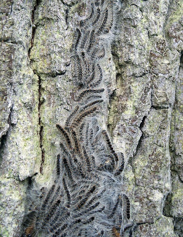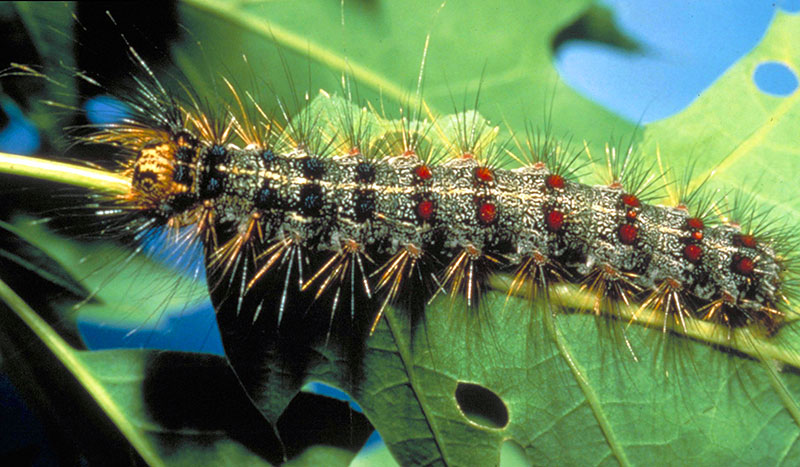 Abb. 3: Die Raupe des Schwammspinners; immer wieder kommt es hier zu Kalamitäten (Foto: J. H. Ghent, Bugwood.org).
