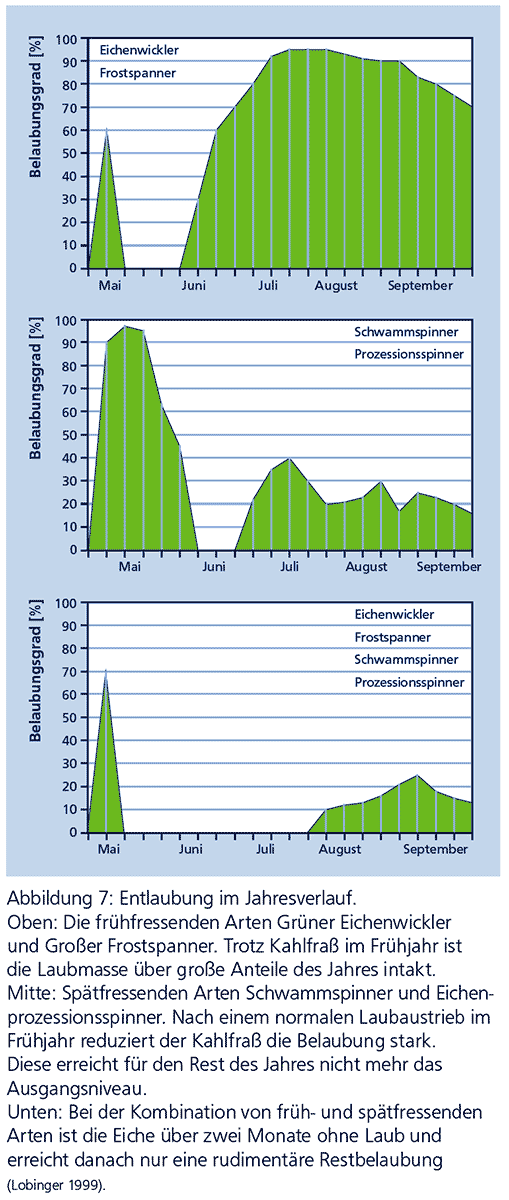 Oben: Die frühfressenden Arten Grüner Eichenwickler und Großer Frostspanner; trotz Kahlfraß im Frühjahr ist die Laubmasse über große Teile des Jahres intakt.