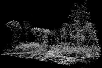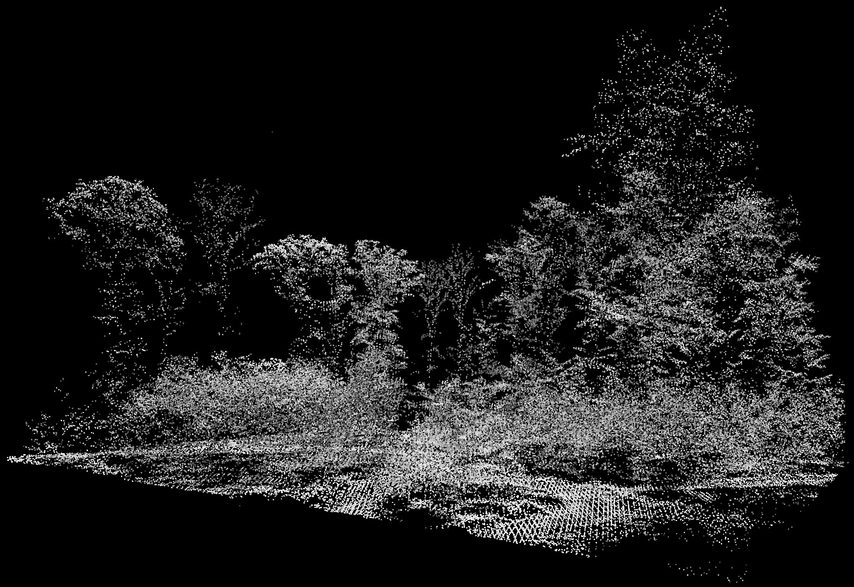 Im Projekt “AirLaserSpec” wurden im Mittel ca. 40 Laserpunkte pro m² gemessen. Wie Abbildung 1 zeigt, kann daraus eine dichte, dreidimensionale Punktwolke abgeleitet werden. Dargestellt ist hier ein kleiner Ausschnitt der Fläche Waldbrunn aus einer Befliegung vom Juli letzten Jahres.