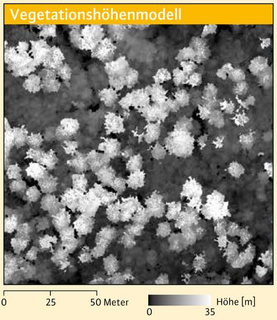 Innerhalb von Waldflächen entspricht das nDOM einem Vegetationshöhenmodell. Abbildung 3 zeigt einen kleinen Ausschnitt des berechneten Vegetationshöhenmodells vom Testgebiet Waldbrunn mit einer räumlichen Auflösung von 0,5 m. Im dargestellten Ausschnitt sind Baumkronen in der obersten Schicht (hier überwiegend Buchen) gut sichtbar. Außerdem ist eine niedrigere zweite Baumschicht vorhanden. Ferner können einzelne kleinere Lücken im Kronendach identifiziert werden.