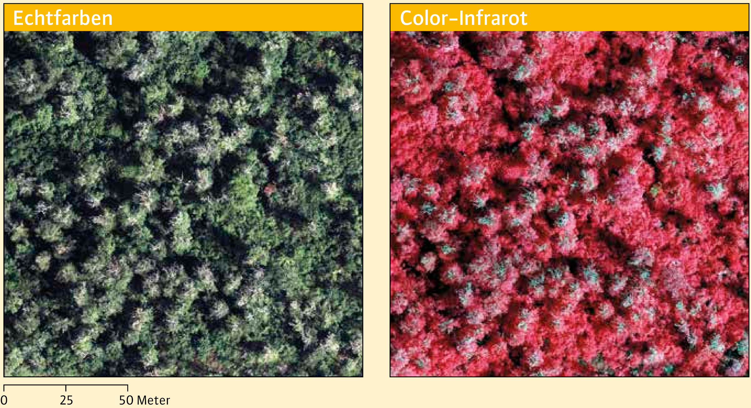 Die im Flugzeug gleichzeitig zur Lasermessung eingesetzte Multispektralkamera erfasst die von der Erdoberfläche reflektierte Sonnenstrahlung. Bei der Befliegung für “AirLaserSpec” wurden vier Spektralbereiche aufgezeichnet: Blau, Grün, Rot und nahes Infrarot. Wie Abbildung 4 verdeutlicht, können durch unterschiedliche Kombinationen der Spektralbänder sowohl Echtfarben-Darstellungen (Rot, Grün, Blau) als auch Color-Infrarot-Darstellungen (nahes Infrarot, Rot, Grün) angefertigt werden. In Abbildung 4 ist derselbe Ausschnitt wie in Abbildung 3 gezeigt. Durch die hohe räumliche Auflösung von 0,1 m der Orthophotos sind die geschädigten Buchen mit entlaubten Kronenteilen gut erkennbar. Besonders gut sichtbar sind die geschädigten Laubhölzer im Color-Infrarot-Bild anhand der hier charakteristischen grün-bläulichen bis weißlich-grauen Farbtöne.