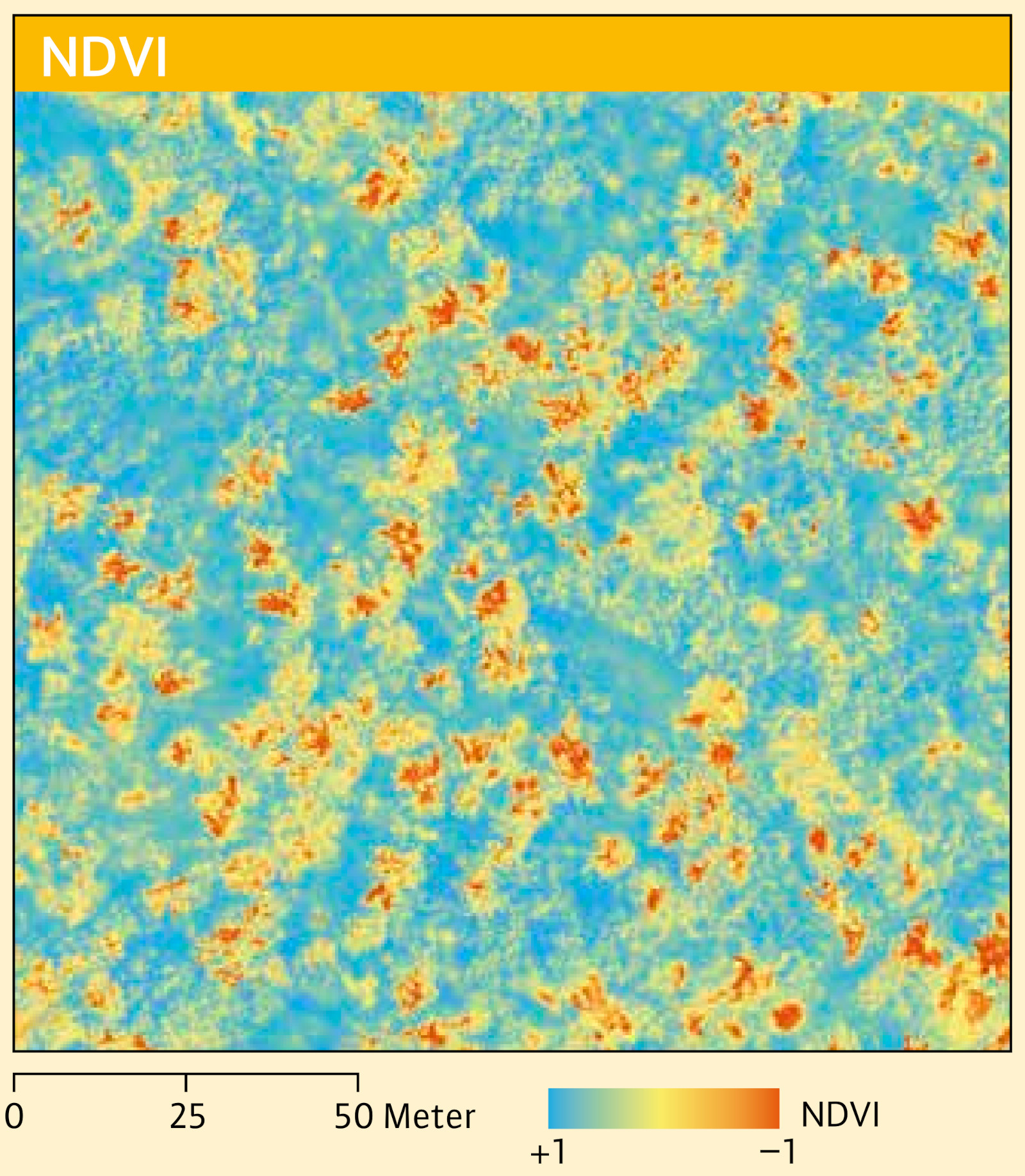 Die Spektralinformation der Luftbilddaten kann auch über Vegetationsindizes analysiert werden. Ein Vegetationsindex ist ein aus den originären Spektralbändern abgeleitetes “künstliches” Band. Im Laufe der Zeit wurden für unterschiedlichste optische Fernerkundungsdaten und Anwendungsgebiete zahlreiche Indizes entwickelt. Je nach Ziel der Auswertung können verschiedene Rechenoperationen zum Einsatz kommen. Um den Unterschied zwischen vitaler und geschädigter Vegetation hervorzuheben, eignet sich die kombinierte Verwendung des sichtbaren roten Spektralbereichs und des nahen Infrarots. Daraus lässt sich zum Beispiel der sogenannte Normalized Difference Vegetation Index (NDVI) berechnen, ein sehr häufig verwendeter Index mit einem Wertebereich von –1 bis +1. Abbildung 5 zeigt, dass die belaubten Bäume durch tendenziell hohe NDVI-Werte charakterisiert sind. Die geschädigten Kronen zeigen dagegen eher niedrige NDVI-Werte. Hierbei ist allerdings zu beachten, dass auch unbewachsene Flächen niedrige NDVI-Werte aufweisen können, weshalb die alleinige Verwendung eines Vegetationsindex zur Schaderfassung meist nicht ausreicht. Dies gilt insbesondere für die Auswertung von großen Waldgebieten. Hier sind weitere Faktoren zu berücksichtigen, die einen Einfluss auf die Ausprägung der Spektralinformation haben, wie zum Beispiel die Topografie oder die Altersklassen der Waldbestände und vieles mehr.