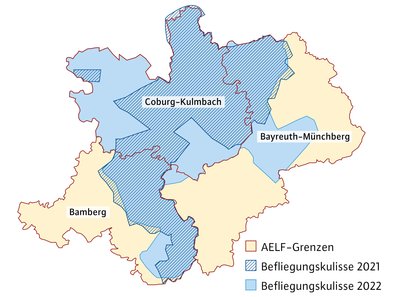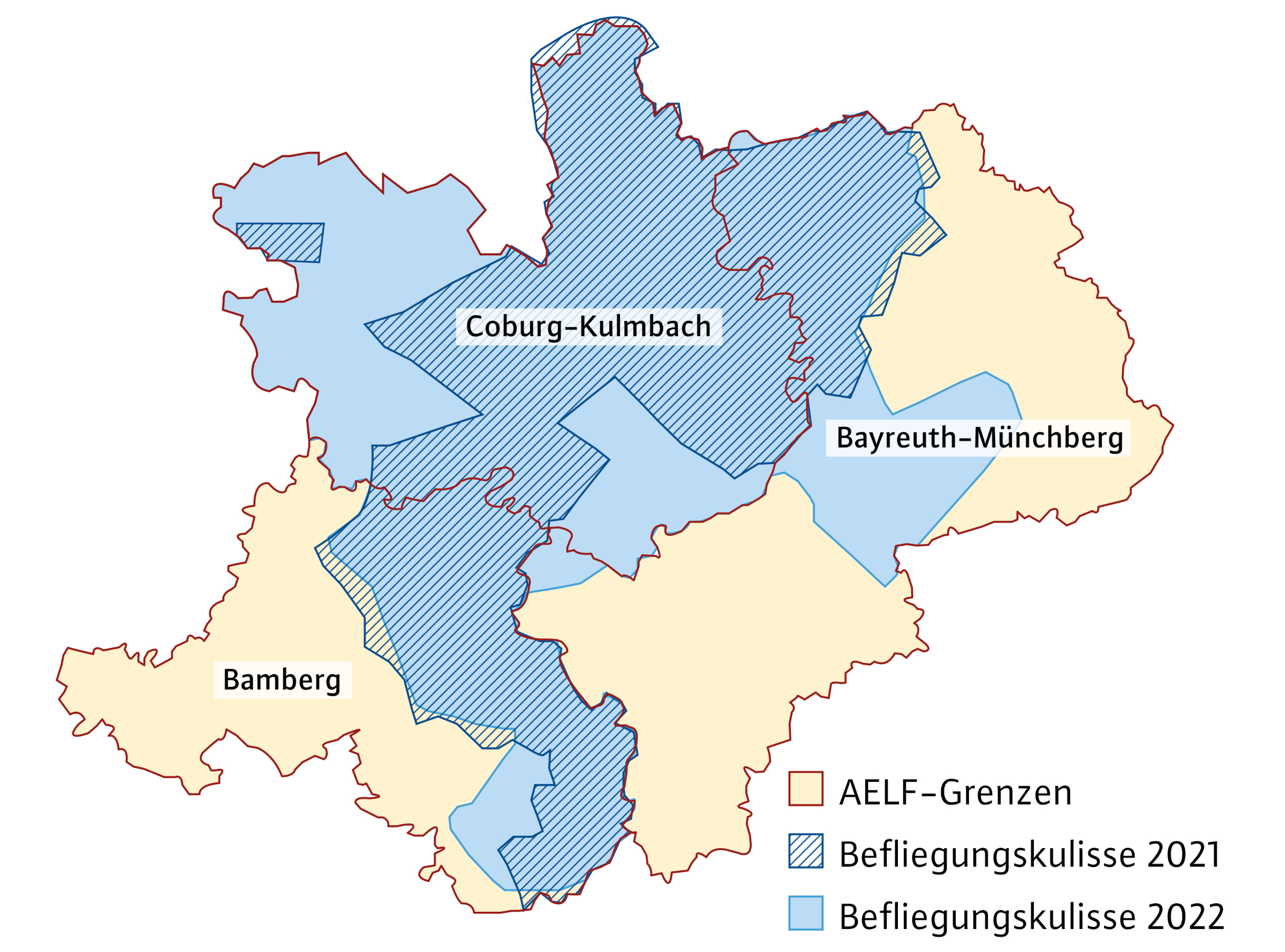 Im August 2021 beauftragte das Bayerische Staatsministerium für Ernährung, Landwirtschaft und Forsten die LWF, einen Fast-Orthophoto-Bildflug für eine 2.840 km² große Fläche in Oberfranken durchführen zu lassen, um damit die dort zuständigen Ämter für Ernährung, Landwirtschaft und Forsten (ÄELF) Bayreuth-Münchberg, Coburg-Kulmbach und Bamberg bei der Erfassung von Borkenkäferschäden zu unterstützen. Die Befliegungskulisse ist in Abbildung 2 dunkelblau schraffiert. Die beauftragte Firma führte den Bildflug am 8. September 2021 bei wolkenfreien Bedingungen durch. Die Bilddaten der Fast-Orthophoto-Befliegung konnten den Ämtern am 14. Oktober 2021 zur Verfügung gestellt werden. Die betroffenen ÄELF erhielten somit 36 Tage nach der Befliegung einen Gesamtüberblick über die Borkenkäferschadflächen. Aufgrund der positiven Rückmeldung der Ämter wurde 2022 ein erneuter Fast-Orthophoto-Bildflug beauftragt.