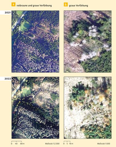 Die Auswertung von Luftbildern kann Feldaufnahmen zwar nicht ersetzen, sie erleichtert aber die Lokalisierung von Befallsherden und unterstützt somit bei der Beratung der betroffenen Waldbesitzer. Über visuelle Bildinterpretation können rotbraun und grau verfärbte Fichten in den Fast-Orthophotos gut differenziert werden, so dass sich solche späteren Befallsstadien erkennen lassen. Eine Früherkennung (green-attack-Stadium) ist mit dem bereitgestellten Bildmaterial allerdings nicht möglich.