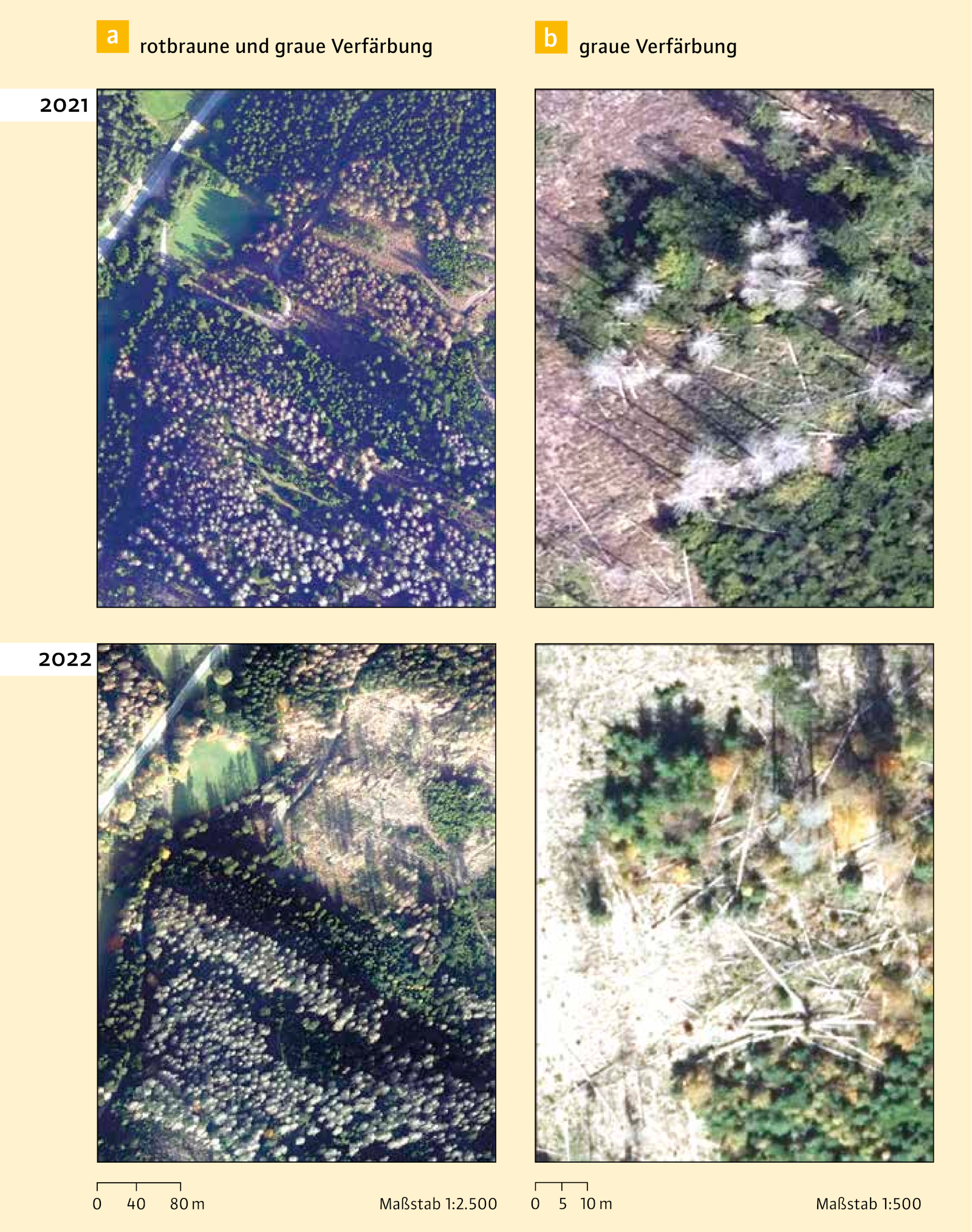Die Abbildungen 3 und 4 zeigen beispielhaft einige Ausschnitte der Fast-Orthophotos von den Herbstbefliegungen 2021 und 2022. Dargestellt sind jeweils Ausschnitte aus dem Frankenwald. Spätere Befallsstadien, bei denen sich die Baumkronen rotbraun oder grau verfärbt haben, können gut identifiziert werden. Durch den Vergleich der Fast-Orthophotos der Jahre 2021 und 2022 lässt sich die Entwicklung des Schadgeschehens in diesem Zeitraum analysieren und dokumentieren. In diesem Zusammenhang verdeutlicht Abbildung 4, dass die Entstehung von Kahlflächen sehr gut sichtbar gemacht werden kann.
