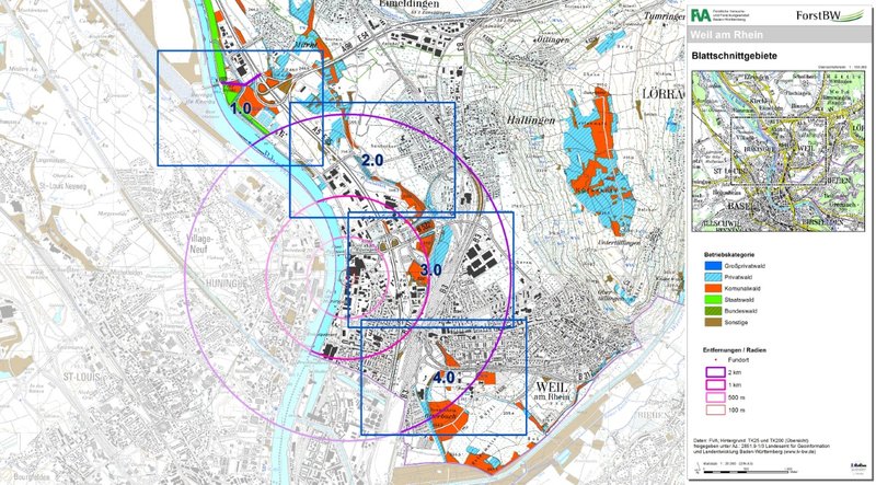 Abb. 3: Quarantänegebiet in Weil am Rhein mit den dargestellten Waldflächen unterschiedlicher Besitzform, die sukzessiv quartierweise kontrolliert werden. Zum Vergrößern bitte anklicken.