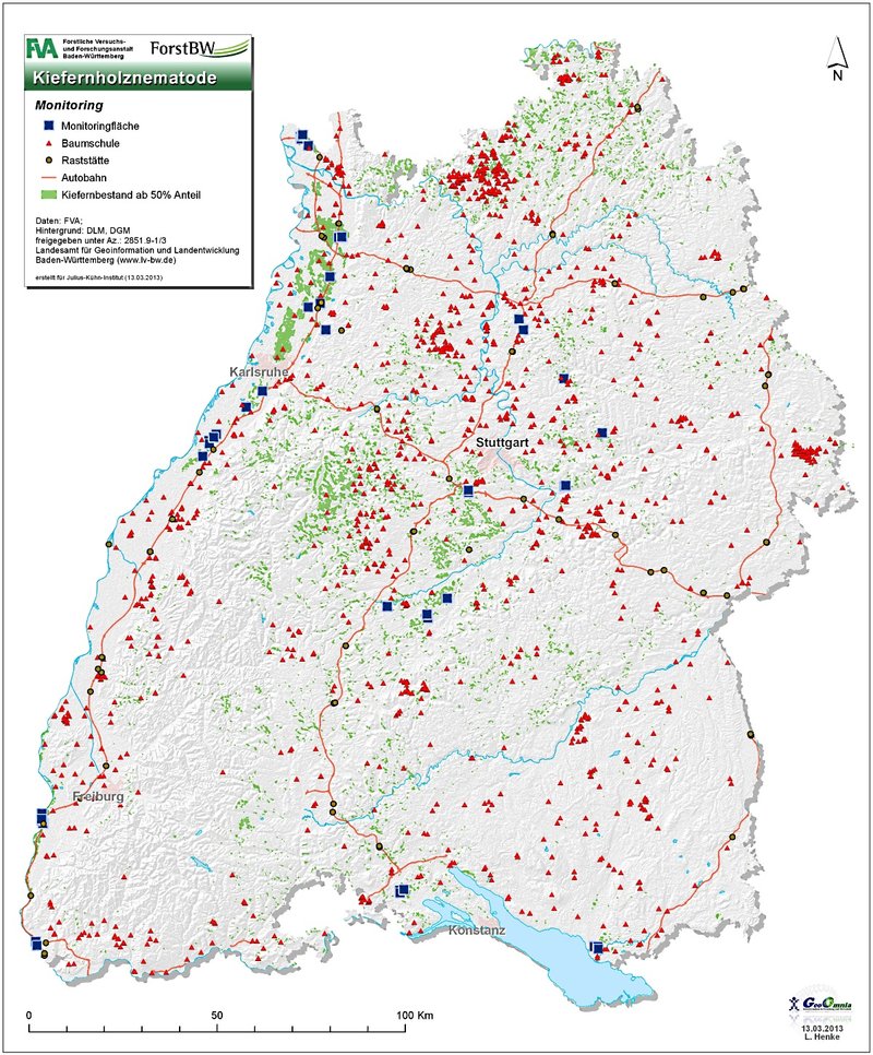 Die insgesamt 37 alljährlich in den Sommermonaten beprobten Beobachtungspunkte sind über die gesamte Landesfläche mit Schwerpunkten in der Rheinebene, im Neckarland und am Bodensee verteilt (Abb. 6). Für die am Landwirtschaftlichen Technologiezentrum Augustenberg (LTZ) molekulargenetisch durchgeführten Laboranalysen dienen repräsentativ aus dem Stammbereich eingeschlagener Kiefern gewonnene Sägespanproben (je 300 g). Die erforderlichen Probefällungen erfolgen dabei an symptomatischen Bäumen. Die Auswertung der Laborergebnisse erbrachte für Baden-Württemberg bislang ausschließlich negative Befunde.