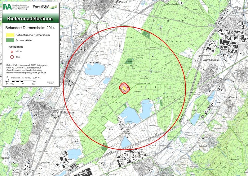 Nach dem Erstnachweis des Erregers für den Wald in Baden-Württemberg im Jahr 2014 wurden zunächst die befallenen Bestände mit Pinus nigra bzw. P. ponderosa eingeschlagen und deren infektiöses Material vollständig vernichtet sowie anschließend ein Monitoring installiert. Seit dem Jahr 2015 werden alle potentiellen Wirtsbäume in einem 150 m-Gürtel sowie alle Bestände mit Schwarz-Kiefer (Hauptwirt) in einem erweiterten 3 km-Radius um den Mittelpunkt der ehemaligen Befallsherde jährlich zweimal (Frühjahr und Herbst) kontrolliert und gegebenenfalls beprobt (Abb. 7).