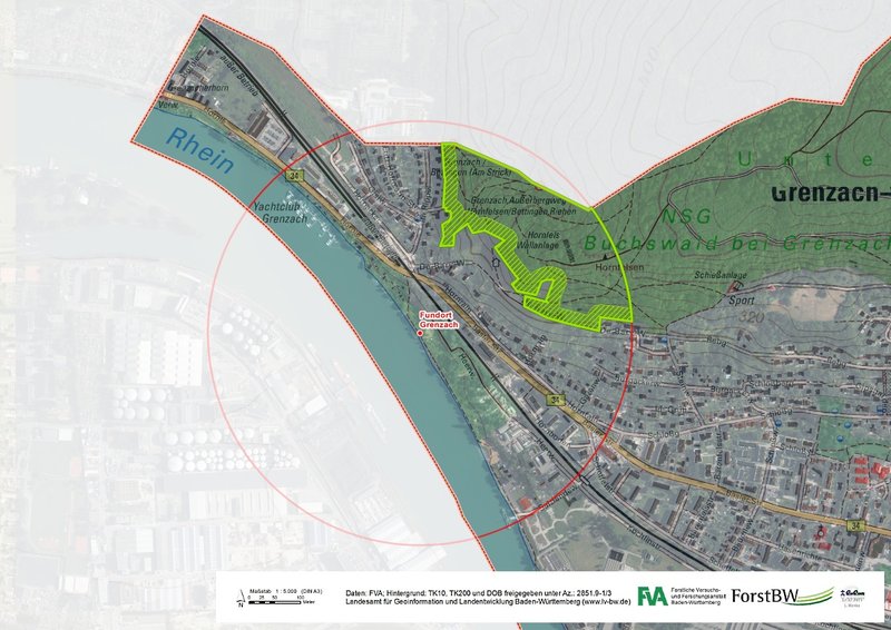 Im Sommer 2015 wurde im nahegelegenen Grenzach an einer Weide im Uferbereich des Rheins ebenfalls ein bis dahin nicht bekannter Befall durch den ALB nachgewiesen. Da die festgestellten Stadien des Käfers sich jedoch nicht mehr in einem lebenden Zustand befanden, zieht der Fund nicht unmittelbar die Ausweisung einer Quarantänezone nach sich. Vielmehr findet zunächst ein intensives Monitoring zur Befallsfeststellung in einem 1 km-Radius um den Befallspunkt statt. Allerdings befinden sich in Grenzach bereits größere Waldflächenanteile (ca. 10 ha) auch in der dem Befallspunkt nahe gelegenen Zone 100 bis 500 m, in der nach den EU-Vorgaben ein intensives Monitoring in den Baumkronen vorgesehen ist (Einsatz von Baumkletterern). Wiederum konnte für den Spezialfall "Wald" eine risikoorientierte Methodenanpassung erwirkt werden. Anstelle der geschätzten 3.000 Bäume in der 500 m-Zone werden nunmehr 100 % des dem Bafallszentrum exponierten Waldrandes bis in eine Tiefe von 30 m (Abb. 5) dem intensiven Kronenmonitoring unterzogen (ca. 1.000 Bäume).