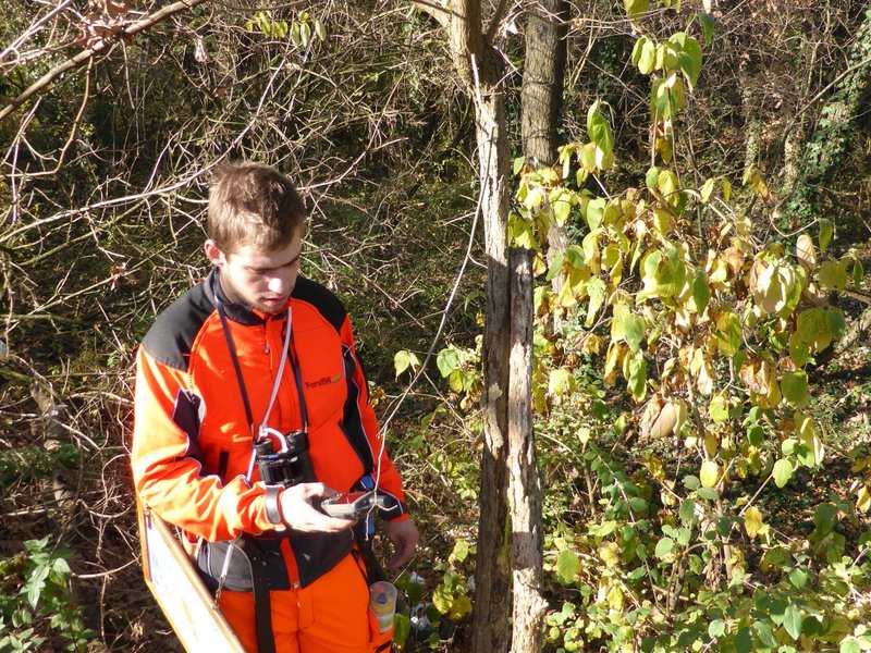 Abb. 1: Datenerfassung von Probebäumen mit Befallsverdacht beim operativen Boden-Monitoring zum Asiatischen Laubholzbockkäfer in der Quarantänezone in Weil am Rhein.