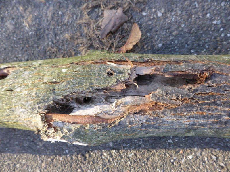 Abb. 2: Stammsegment eines eingeschlagenen Probebaumes mit Befallsverdacht wegen Ein- und Ausbohrlöchern.