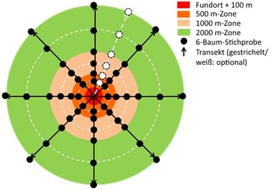 Da erstmals in Deutschland größere Waldflächen von den Notmaßnahmen betroffen sind, deren Aufwand sich im Vergleich zum Offenland bzw. urbanen Bereichen unterscheidet, konnte in der aktuellen Fassung der deutschen ALB-Leitlinie eine Modifizierung für das Monitoring im Wald erzielt werden. Die Methodik sieht nunmehr eine Vollaufnahme der prädestinierten Wirtsbaumarten in numerisch dem Gebiet angepassten 6-Baum-Stichproben vor, die entlang von Transekten auf Hilfsradien in der Untersuchungszone einzurichten sind und dabei durch die Kreisform des Quarantänegebietes eine systematische Abnahme der flächenbezogenen Stichprobenanzahl mit zunehmender Entfernung vom Befallszentrum gewährleisten (Abb. 4).