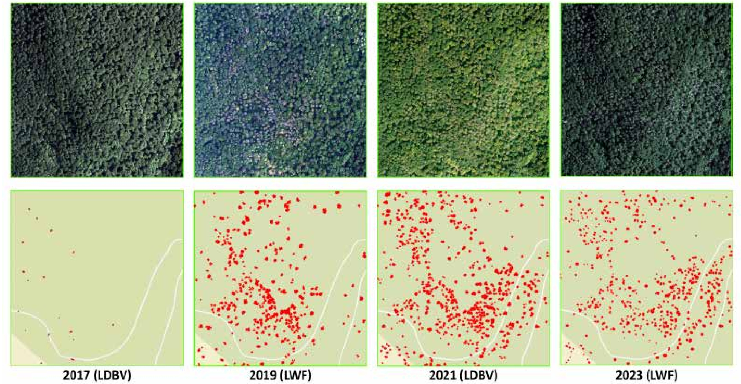 Dies unterstreicht die Notwendigkeit fernerkundungsbasierter Monitoringsysteme mit häufigeren Aktualisierungen, um Waldschäden frühzeitig zu erkennen und rechtzeitig geeignete Waldschutzmaßnahmen einzuleite. Darüber hinaus werden die unzureichende räumliche Auflösung zur Erkennung einzelner geschädigter Bäume sowie die Schwierigkeit, einen frühen Borkenkäferbefall zu erkennen, erwähnt.