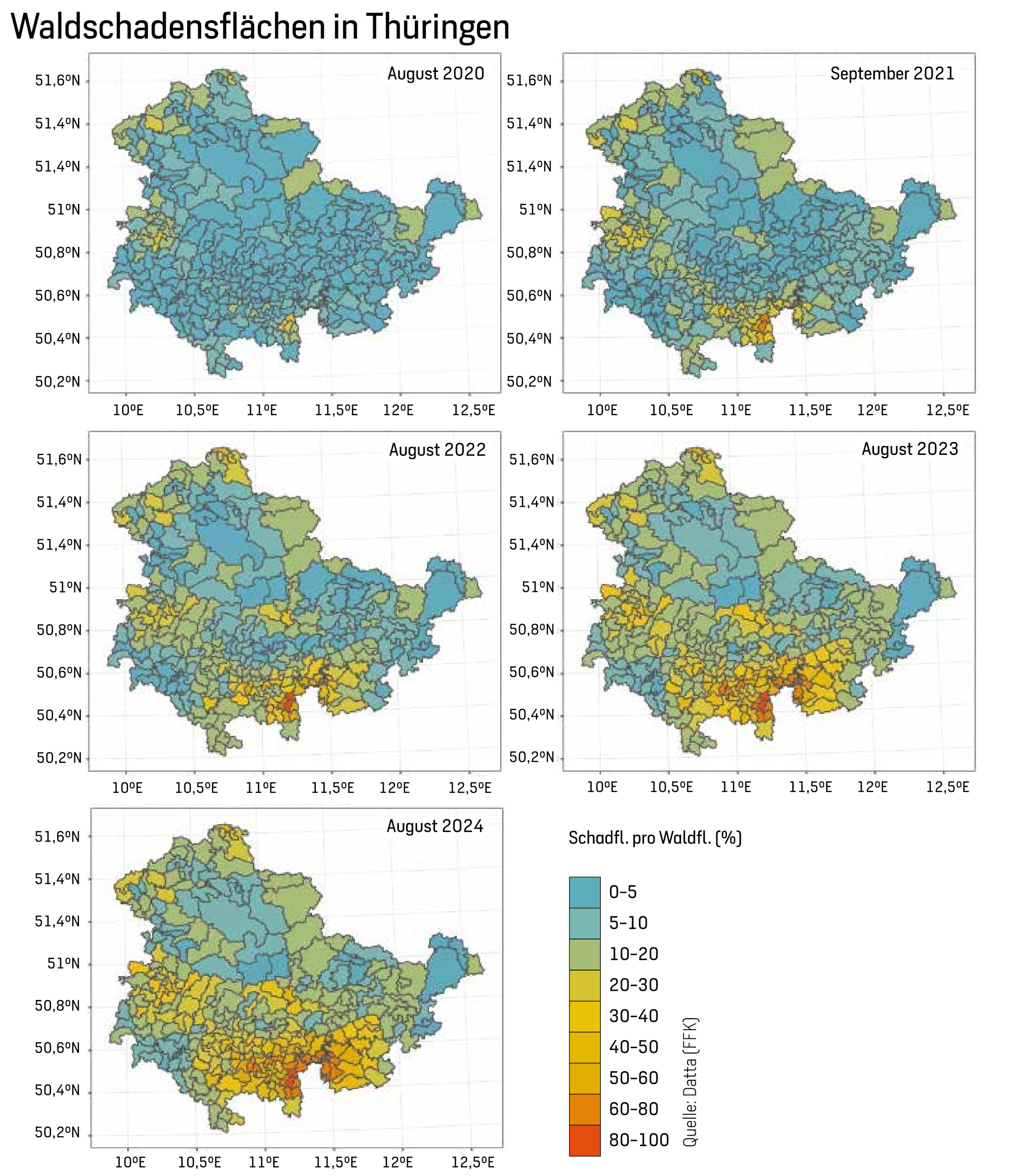 Fernerkundungsprodukte bieten für Forstpraktiker einen großen Mehrwert, da sie wertvolle Informationen zum Monitoring von Waldschäden liefern. Ein Beispiel hierfür ist das Waldschadflächenprodukt (Abb. 3) von ThüringenForst AöR, das seit Sommer 2020 mithilfe von Sentinel-2-Satellitenbildern Waldschäden zweimal jährlich erfasst. Das Produkt ist im Thüringen-Viewer-Portal frei verfügbar und stellt kumulierte Waldschäden dar, die im Vergleich zum Ist-Zustand vom 1. Juli 2018 in Thüringen ermittelt wurden.