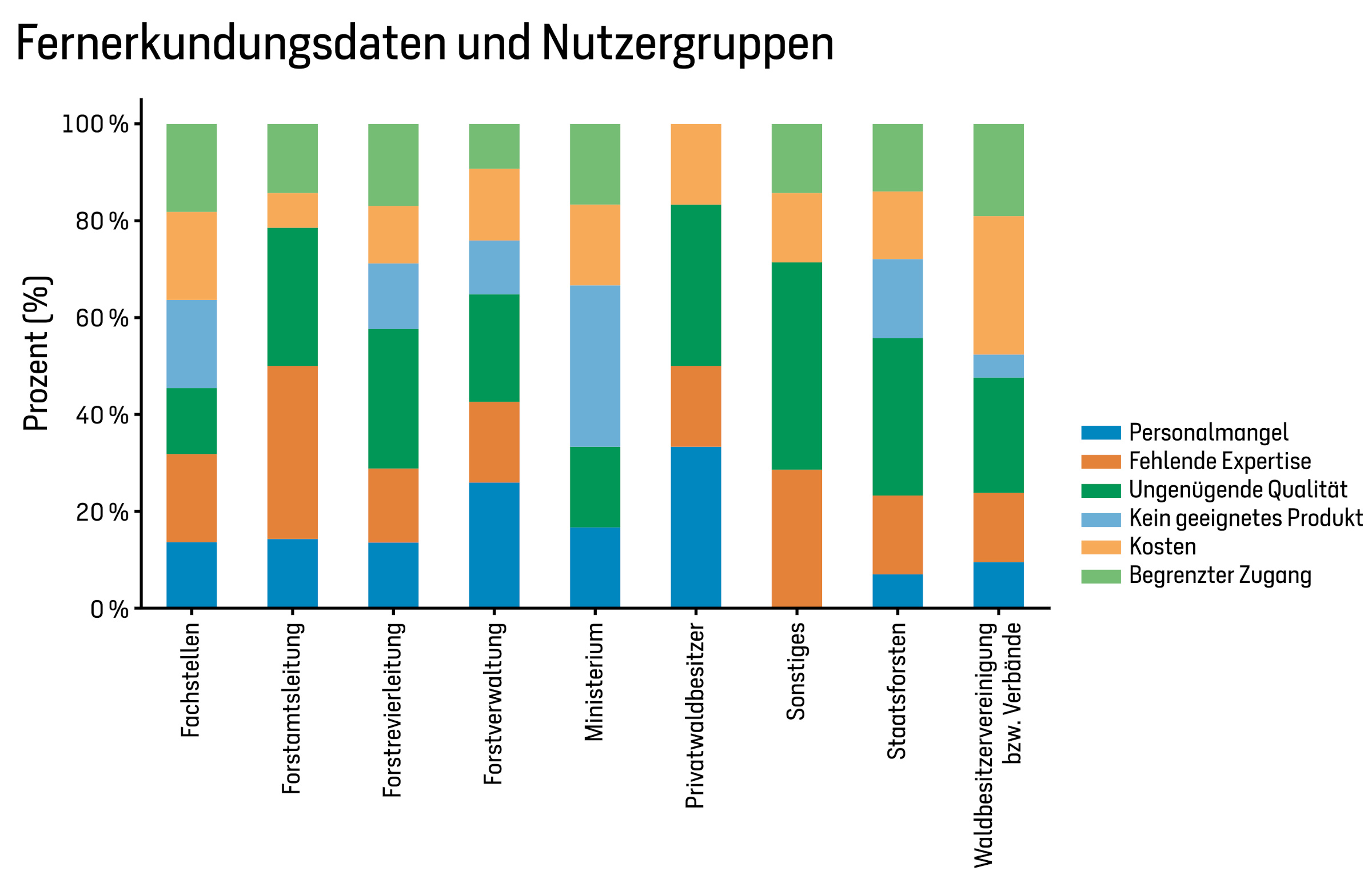 Insbesondere für private Waldbesitzende stellten diese Aspekte – neben der als unzureichend wahrgenommenen Genauigkeit von Fernerkundungsprodukten – die größten Hürden dar. Zwar hat die zunehmende Verfügbarkeit von Open-Source-Fernerkundungsdaten möglicherweise dazu beigetragen, die Anschaffungskosten zu senken, jedoch bleiben die Kosten für den Zugang zu diesen Daten, deren effiziente Nutzung sowie die forstfachliche Interpretation weiterhin hoch. Diese Herausforderung wurde von über 14 % aller Befragten als Grund genannt, warum sie keine Fernerkundungsdaten einsetzen (Abb. 4).