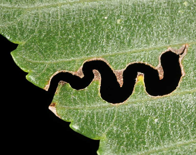 Die deutschen Ulmen werden nach dem Ulmensterben (Pilzerkrankung) nun von einem neuen Schadinsekt bedroht: Die Ulmenblattwespe (Aproceros leucopoda). Das Insekt befällt alle heimischen Arten der Gattung Ulmus, unabhängig von Alter und Standort und hat Deutschland nun über das Donautal von Österreich her erreicht. Nachgewiesen wird die Wespe in Osteuropa seit 2003, in Österreich seit 2009. Bei ihrem Reifungsfraß frisst die Larve der Ulmenblattwespe einen charakteristischen Zickzack-Gang ins Blatt (Abb. 1). Dieser Fraß kann zu einem Zurücksterben der Belaubung und damit zum Verlust von Blattmasse führen. Der Erfolg der als invasiv eingestuften Art gründet sich auf ihre ungeschlechtliche Vermehrung und die Entwicklung von bis zu vier Generationen pro Jahr. Natürliche Feinde sind nicht bekannt. Experten gehen davon aus, dass die Art wahrscheinlich den größten Teil des europäischen Ulmen-Verbreitungsgebietes besiedeln wird.