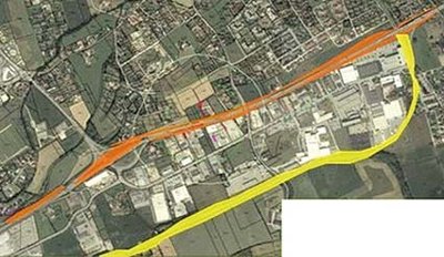 Abbildung: Geplante Präventivrodungen im Winter 2008/2009 auf den Straßenböschungen beidseitig der B 148 (orange) und entlang des AMAG-Werksgleises (gelb)