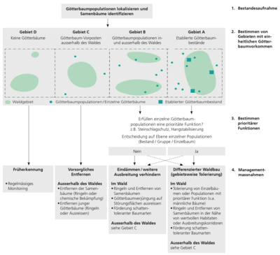 Abb. 7. Entscheidungsdiagramm für ein differenziertes Management von Götterbaumpopulationen. Das Entscheidungsdiagramm zeigt Managementoptionen je nach Gebiet auf (A-D). Details zu den Managementmassnahmen finden sich im Originalartikel (PDF).