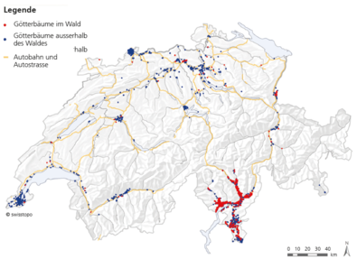 In der Schweiz befindet sich das Hauptverbreitungsgebiet des Götterbaums aktuell im Tessin sowie in den milden Lagen von Mittelland, Wallis und Churer Rheintal. Nördlich der Alpen kommt er hauptsächlich in Städten (z. B. Basel, Zürich) und deren näheren Umgebung sowie entlang von Hauptverkehrsrouten vor (Abb. 4). Die wenigen adulten Götterbaumbestände in Schweizer Wäldern wachsen meist auf Blockschutt, wo die Art besonders konkurrenzstark ist (Abb. 5).