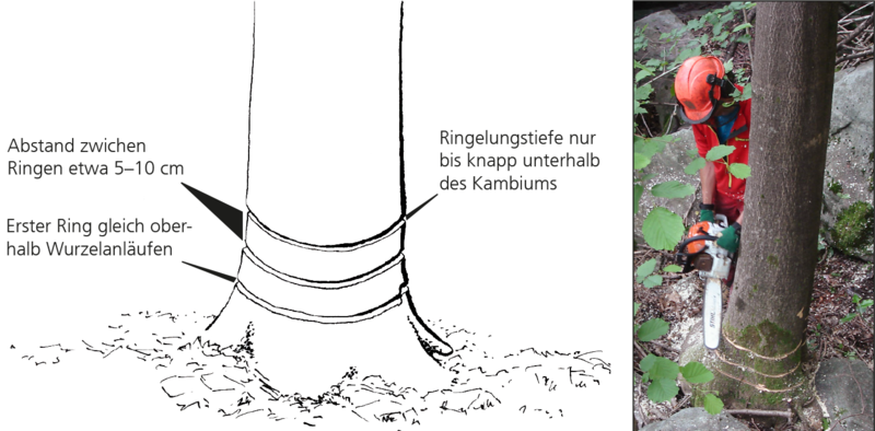 Bei der Ringelung werden die Borke und das Kambium am Stammfuss mit einer Motor- oder Ringelungssäge in drei Ringen durchtrennt. Dabei muss das Kambium um den ganzen Stamm vollständig durchtrennt werden, während das Splintholz so wenig wie möglich verletzt werden darf. Dadurch investieren geringelte Bäume nicht die gesamte Energie in Stock- und Wurzelausschläge wie nach einer Fällung. Zu tiefes Ringeln ist kontraproduktiv!