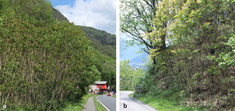 Abb. 8. Dichte Götterbaumvorkommen nach mechanischer Bekämpfung. a) Stockausschläge und Wurzelbrut nach der Fällung adulter Götterbäume. b) Stockausschläge nach mehrmaligem Zurückschneiden durch Strassenunterhaltsdienste. Fotos: Simon Knüsel
