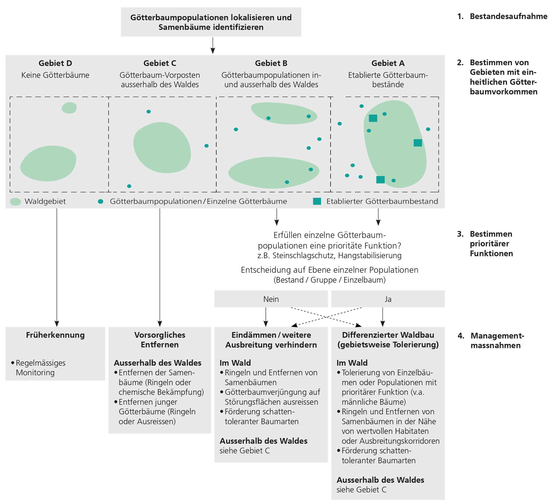 Der Götterbaum ist in der Schweiz unterschiedlich verbreitet, von götterbaumfreien Gebieten bis zu Gebieten mit vielen etablierten Populationen. Der Götterbaum gilt in der Schweiz als invasive Baumart und befindet sich auf der Schwarzen Liste invasiver Neophyten der Info Flora. Der Umgang mit dem Götterbaum stellt Forstdienste, Grünflächen- und Naturschutzverantwortliche vor grosse Herausforderungen. Ein differenziertes Management hilft, negative Auswirkungen mit angemessenem Aufwand zu minimieren. In Gebieten, wo der Götterbaum bisher nicht vorkommt, ist eine vorsorgliche Entfernung neu auftretender Individuen angezeigt. In Gebieten hingegen, wo dies die vorhandenen Mittel oder Möglichkeiten übersteigt, sind differenzierte Massnahmen nötig. Getroffenen Managementmassnahmen sind regelmässig zu überprüfen und gegebenenfalls den veränderten Umständen anzupassen.
