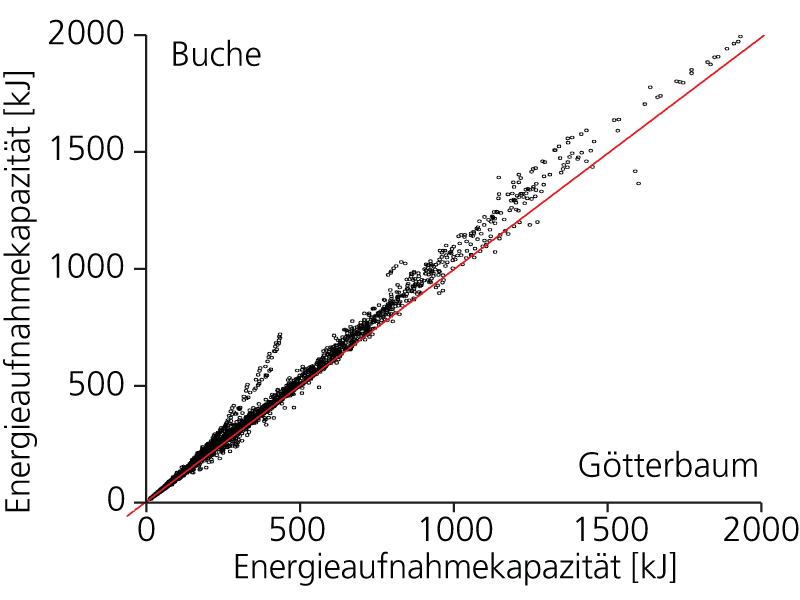 Götterbäume reduzieren die Energie eines Steinschlags ähnlich stark wie Buchen (Abb. 3a-c). Der Steinschlagschutz in Waldbeständen mit Götterbäumen bleibt potenziell bestehen. Götterbaum-Reinbestände sind im Vergleich zu Edelkastanien- oder Buchenbeständen weniger stabil gegenüber Rutschungen. Einzelne, beigemischte ältere Götterbäume erhöhen hingegen die Wurzelverstärkung des Bodens, da sie zu einer Diversifizierung der Durchwurzelungstiefe auf Bestandesebene beitragen.