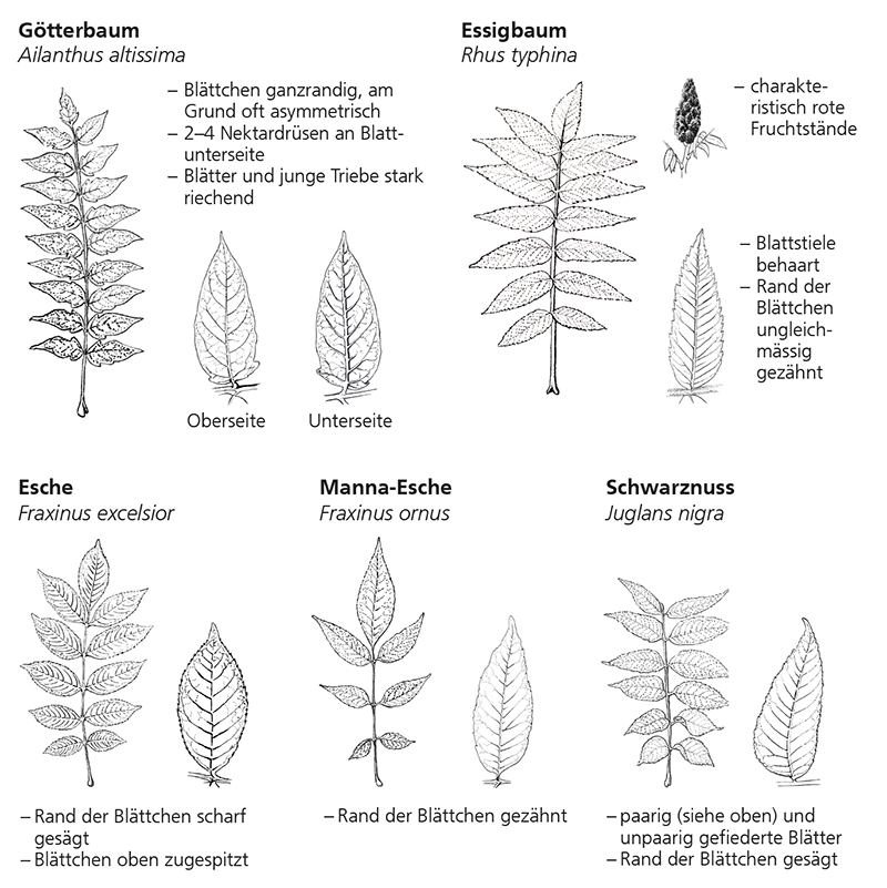 - Verwechslungsmöglichkeiten: Essigbaum, Esche, Manna-Esche und Schwarznuss (Abb. 2).