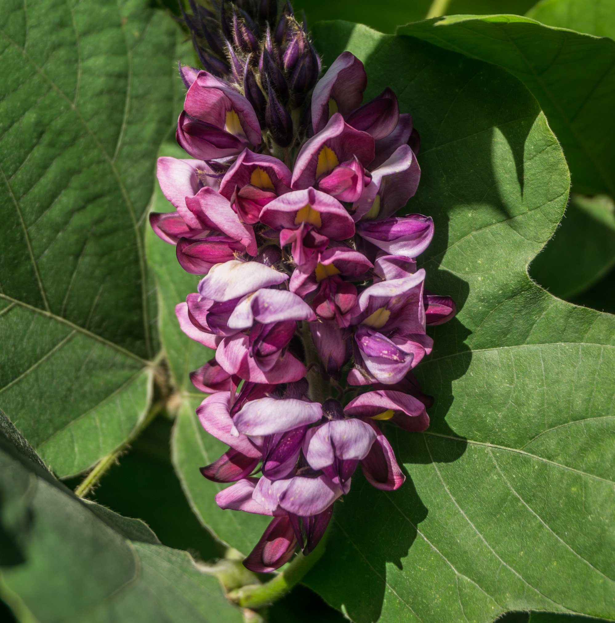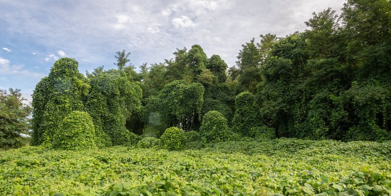 Kudzu (Pueraria lobata) ist eine mehrjährige Kletterliane mit dreilappigen Blättern aus der Familie der Hülsenfrüchtler (Fabaceae), ist in Südostasien beheimatet und zeichnet sich durch ein extrem schnelles Wachstum aus: bis zu 26 cm pro Tag und 20 m pro Jahr! Kudzu bildet ein vernetztes System von vertikalen und horizontalen Lianen. Aus den Wurzelknoten der horizontalen Lianen können sich unterirdische Knollen entwickeln, die einen Vorrat an Nährstoffen und Wasser bilden und beachtliche Volumina und Gewichte von bis zu 180 kg erreichen. Die Knoten können sich von der Mutterpflanze abtrennen und neue autonome Individuen entwickeln (generative Reproduktion ähnlich wie bei Erdbeeren). Bei vertikalem Wachstum und direkter Sonneneinstrahlung bildet Kudzu violette Blüten in Büscheln, aus denen sich dunkelbraune Schoten mit je 3–10 Samen entwickeln (reife Samen sind durch ihre dunklere Farbe von unreifen zu unterscheiden). Aufgrund der hohen Keimungsrate der Samen von etwa 75% und der Fähigkeit, mehrere Jahre zu überleben, ist die Bildung einer Samenbank im Boden sehr wahrscheinlich.