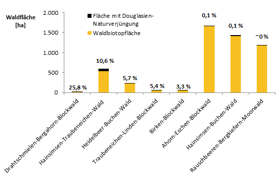 Abb. 2: Naturverjüngung der Douglasie in seltenen, naturnahen Waldlebensräumen in Baden-Württemberg. Die Flächenanteile der Naturverjüngung (in %) bezieht sich auf die Fläche je Waldbiotoptyp (Waldbiotopkartierung, Stand 2015). Anmerkung: Der Hainsimsen-Buchenwald wird nur in jenen Wuchsgebieten durch die Waldbiotopkartierung erfasst, in denen er regional selten ist.
